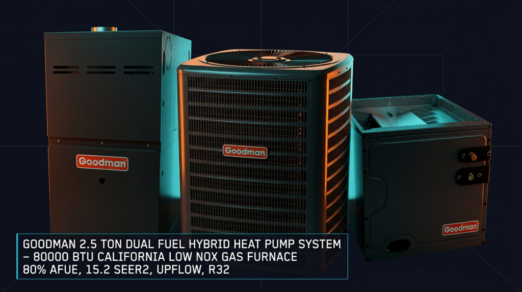 The Goodman 2.5 Ton Dual Fuel Hybrid Heat Pump System combines the GLZS4BA3010 heat pump with a California Low NOx gas furnace for efficient year-round heating and cooling. This system is designed for mid-sized homes that need both cooling performance and backup gas heating with reduced emissions compliance. At 15.2 SEER2 efficiency, it delivers reliable comfort while lowering utility costs.