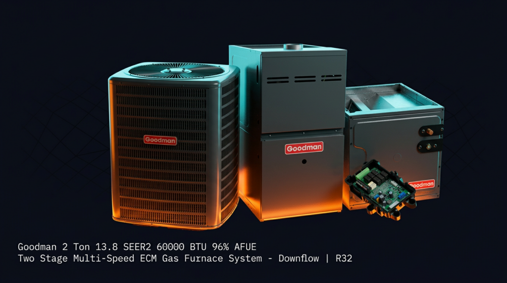 The Goodman 2 Ton 13.8 SEER2 60000 BTU 96% AFUE Two Stage Multi-Speed ECM Gas Furnace System delivers high-efficiency heating and cooling for residential applications. This downflow configuration pairs a high-SEER2 air conditioner with a dual-stage furnace, making it ideal for homeowners seeking lower utility bills without sacrificing comfort. The R32 refrigerant and multi-speed ECM technology reduce runtime and noise while maintaining consistent temperature control.