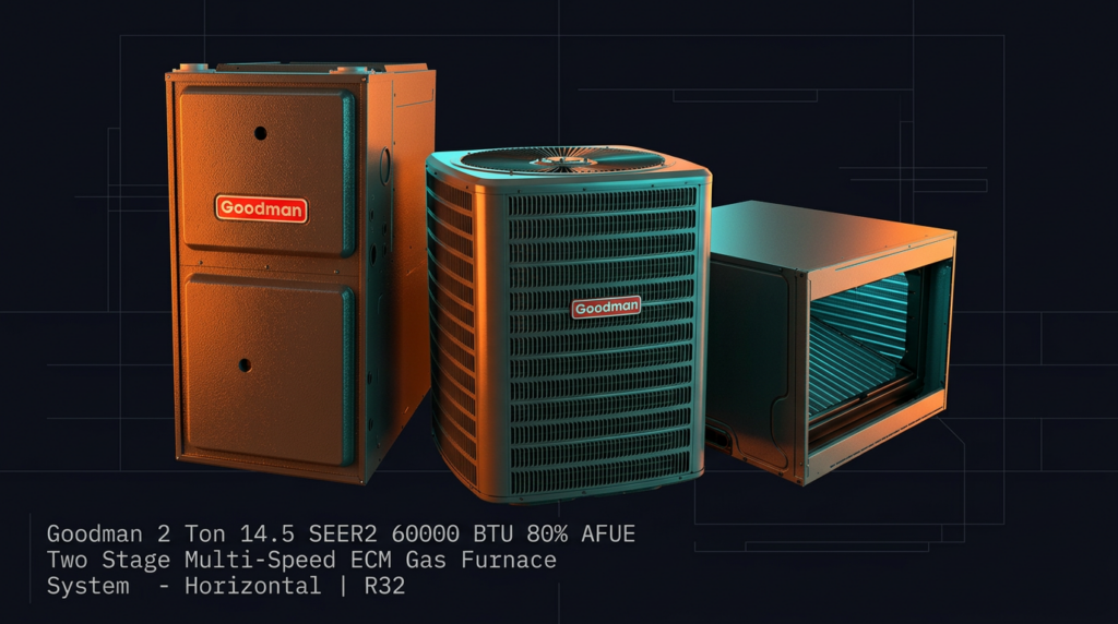 The Goodman 2 Ton 14.5 SEER2 60000 BTU 80% AFUE Two Stage Multi-Speed ECM Gas Furnace System delivers efficient heating and cooling for residential applications using R32 refrigerant. This horizontal unit pairs a high-efficiency condenser with a two-stage gas furnace and includes a factory-installed evaporator coil. It’s designed for homeowners and contractors seeking reliable performance with lower operating costs.