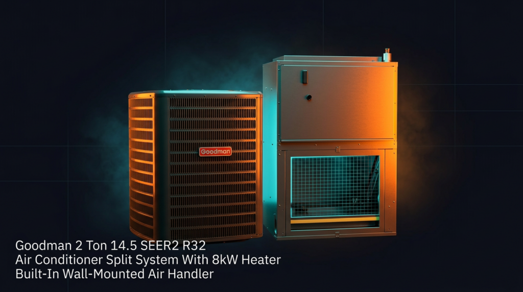 The Goodman 2 Ton 14.5 SEER2 R32 Split System with 8kW Built-In Heater combines a high-efficiency outdoor condenser with a wall-mounted air handler for both cooling and heating applications. This system is designed for homeowners and contractors seeking an energy-efficient solution with integrated heating capability in a compact, wall-mounted format. The R32 refrigerant and advanced compressor technology deliver superior efficiency while maintaining full system reliability.
