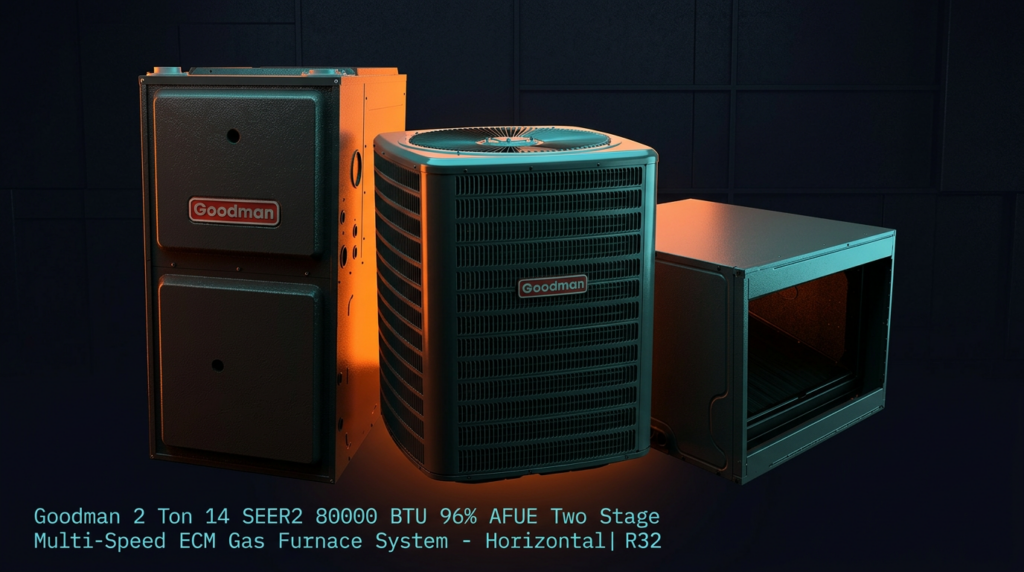 The Goodman 2 Ton 14 SEER2 80000 BTU 96% AFUE Two Stage Multi-Speed ECM Gas Furnace System delivers efficient heating and cooling for residential applications. This horizontal R32 system combines a high-efficiency condenser with a two-stage gas furnace and matching evaporator coil, designed for homeowners seeking reliable climate control with lower operating costs.