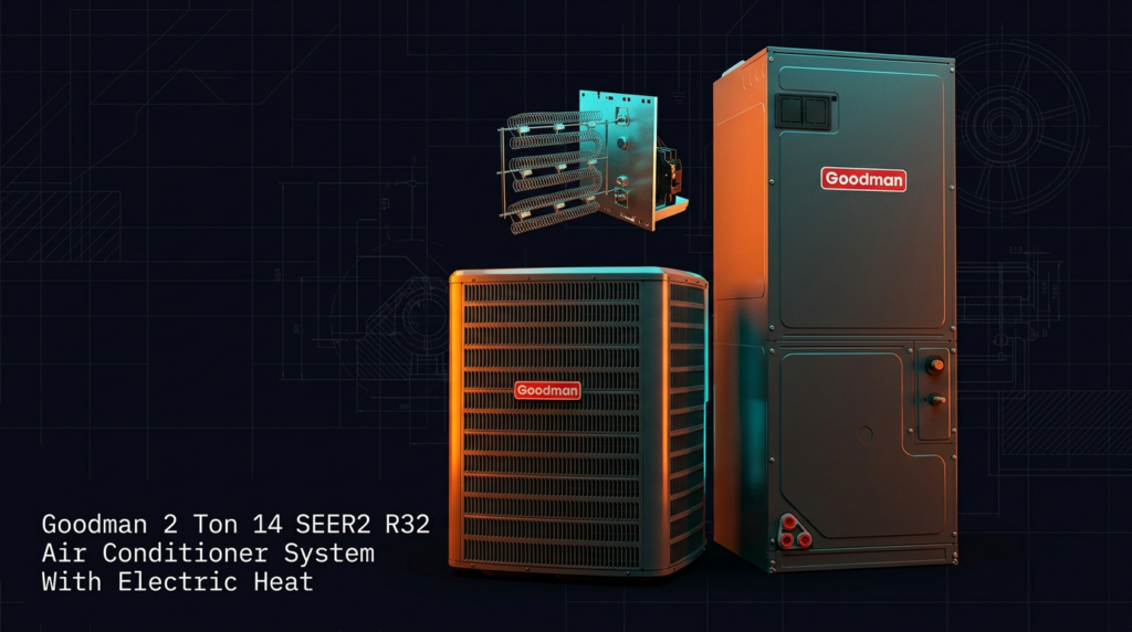 The Goodman 2 Ton 14 SEER2 R32 Air Conditioner System with Electric Heat is a high-efficiency split system designed for homeowners seeking modern refrigerant technology and reliable cooling and heating. This unit pairs the GLXS3B condenser with the AMST24BU1300 air handler and includes electric heat, making it a complete HVAC solution. The R32 refrigerant and 14 SEER2 rating deliver energy efficiency while maintaining compatibility with existing ductwork.