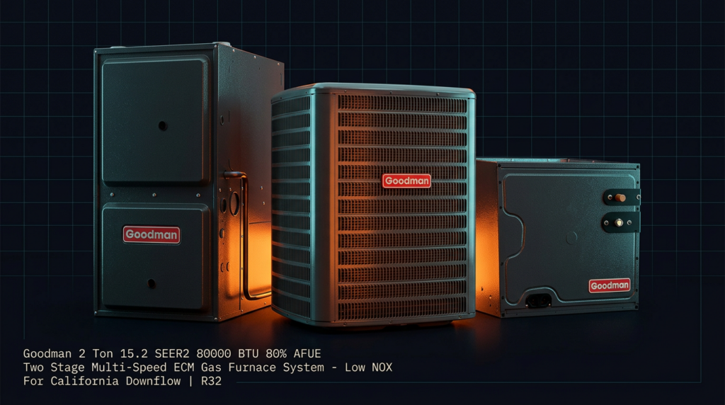 Goodman 2 Ton 15.2 SEER2 80000 BTU 80% AFUE Two Stage Multi-Speed ECM Gas Furnace System – Low NOX For California Downflow | R32