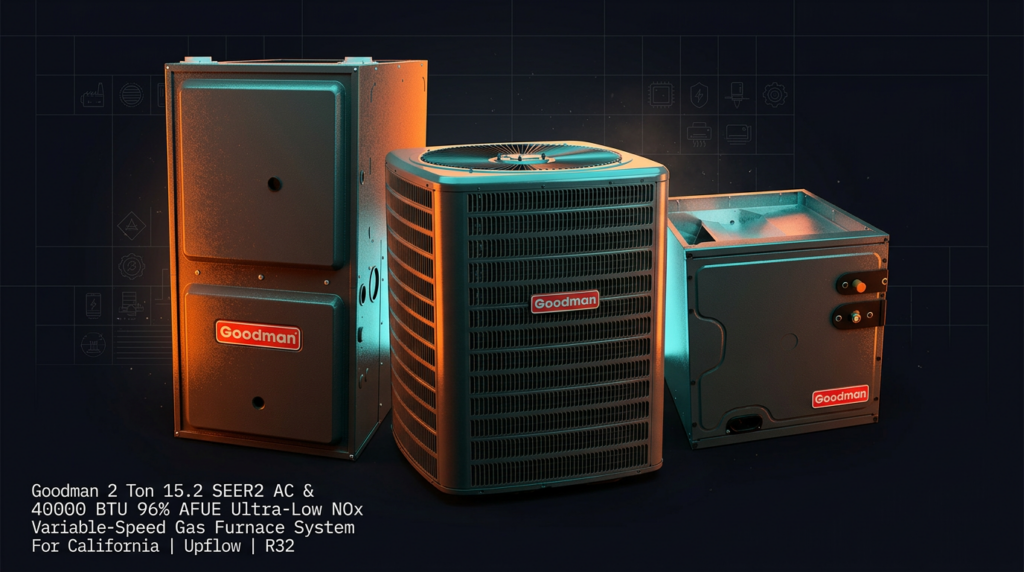 The Goodman 2 Ton 15.2 SEER2 AC and 40000 BTU 96% AFUE Ultra-Low NOx Variable-Speed Gas Furnace System delivers high-efficiency cooling and heating in a single package designed for California’s strict air quality standards. This R32 system meets SCAQMD Rule 1111 and SJVUAPCD Rule 4905 NOx emission limits, making it eligible for installation in South Coast and San Joaquin Valley districts. It combines a high-efficiency scroll compressor condenser with a heavy-duty stainless-steel furnace for reliable year-round performance.