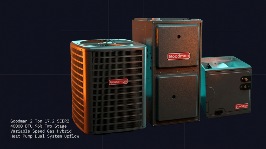 The Goodman 2 Ton 17.2 SEER2 40000 BTU Two Stage Variable Speed Gas Hybrid Heat Pump Dual System is a complete heating and cooling solution combining a high-efficiency heat pump condenser with a 96% two-stage gas furnace. This hybrid system delivers superior efficiency by leveraging heat pump technology for mild weather operation and switching to gas heat during cold snaps, making it ideal for contractors and homeowners seeking lower operating costs without sacrificing heating capacity.