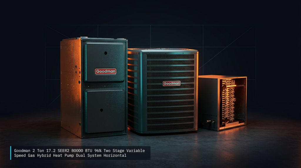 The Goodman 2 Ton 17.2 SEER2 Hybrid Heat Pump Dual System delivers efficient heating and cooling for residential applications using a two-stage variable speed setup. This system pairs the GSZC7 condenser with the GMVC96 furnace and includes integrated ComfortBridge technology for seamless communication between components. It’s designed for homeowners seeking high efficiency with the flexibility of dual-fuel operation.