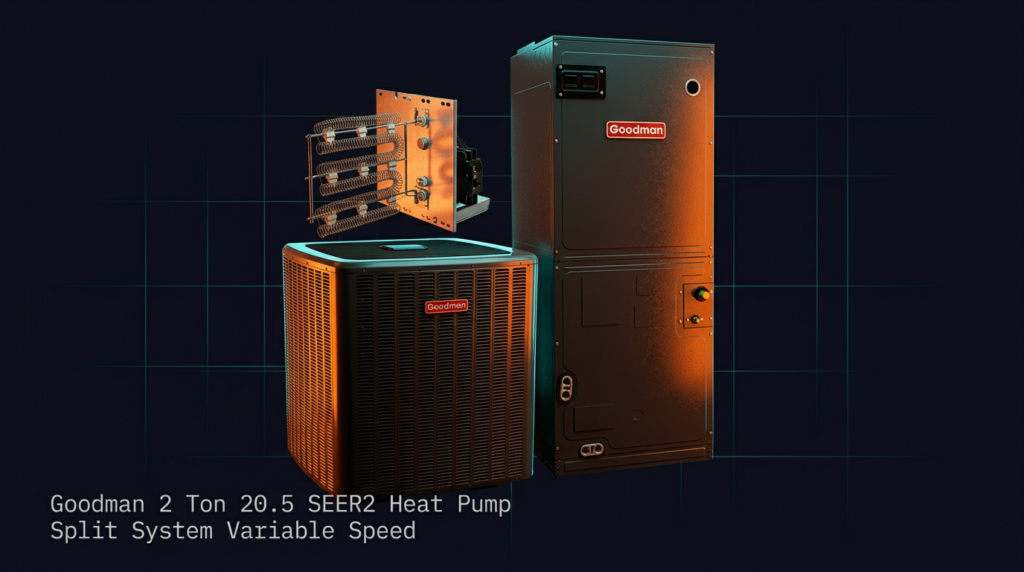 The Goodman 2 Ton 20.5 SEER2 Heat Pump Split System with Variable Speed compressor delivers efficient heating and cooling for residential applications. This system combines the GSZV9 condenser with the AMVE air handler to provide reliable performance and smart controls. The variable-speed design reduces energy consumption while maintaining consistent comfort.