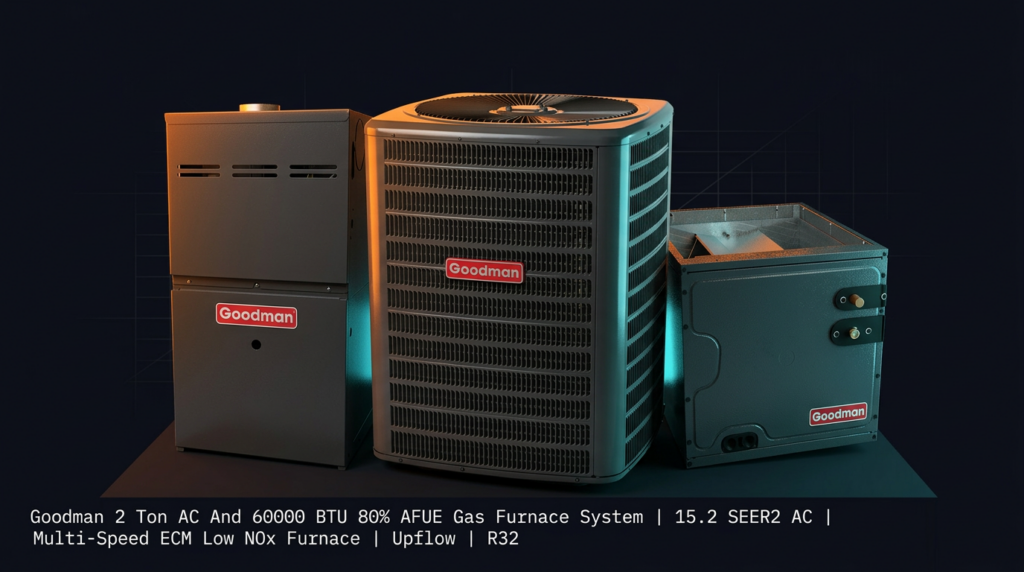 The Goodman 2 Ton AC and 60000 BTU 80% AFUE Gas Furnace System delivers efficient heating and cooling in a single package rated at 15.2 SEER2. This upflow configuration pairs an R32 condenser with a multi-speed ECM low NOx furnace, making it suitable for homeowners seeking reliable performance and lower emissions. The system is AHRI certified and ETL listed for dependable operation.