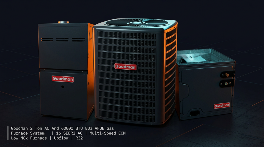 The Goodman 2 Ton AC and 60000 BTU 80% AFUE Gas Furnace System delivers reliable heating and cooling for residential applications with a 16 SEER2 R32 air conditioner and multi-speed ECM low NOx furnace. This upflow configuration combines efficient cooling technology with a high-efficiency gas furnace in a single matched system. The package is ideal for homeowners seeking dependable performance with lower operating costs and reduced environmental impact.