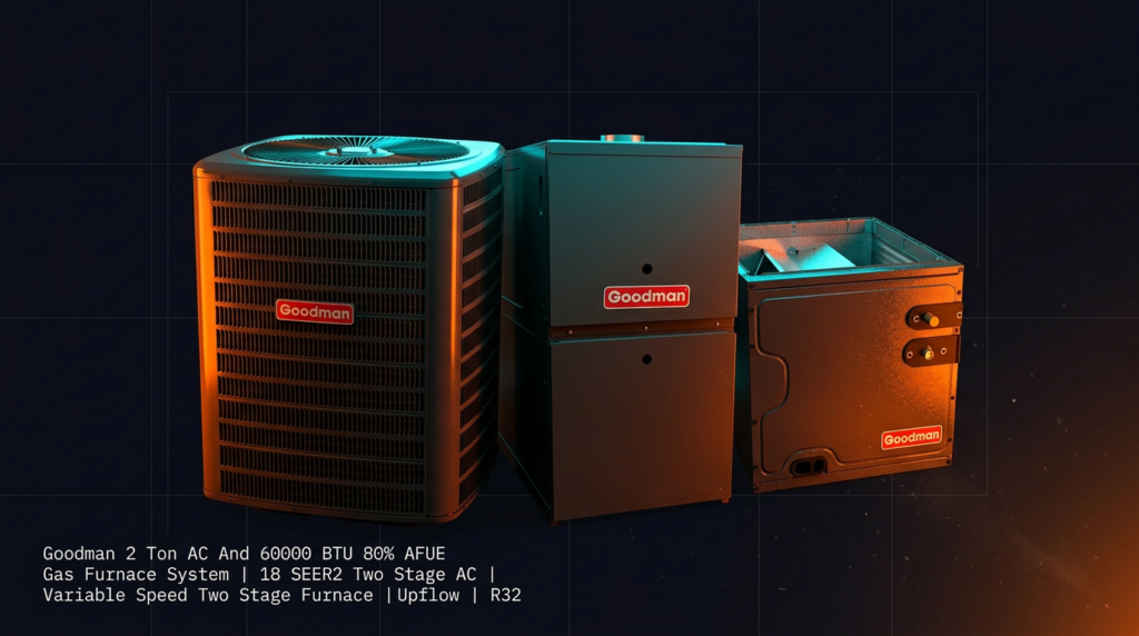 Goodman 2 Ton AC And 60000 BTU 80% AFUE Gas Furnace System | 18 SEER2 Two Stage AC | Variable Speed Two Stage Furnace | Upflow | R32