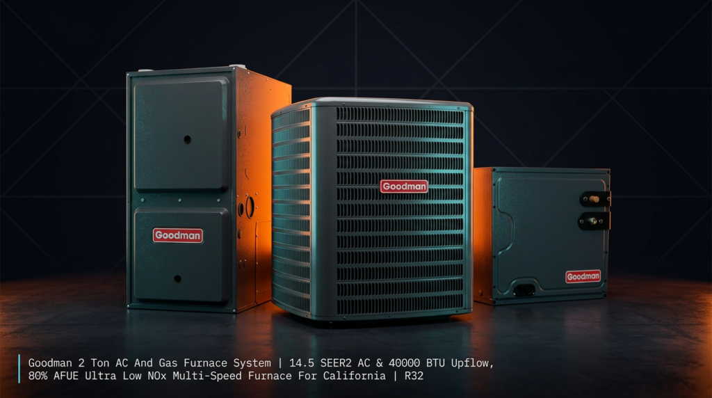 Goodman 2 Ton AC And Gas Furnace System | 14.5 SEER2 AC & 40000 BTU Upflow, 80% AFUE Ultra Low NOx Multi-Speed Furnace For California | R32