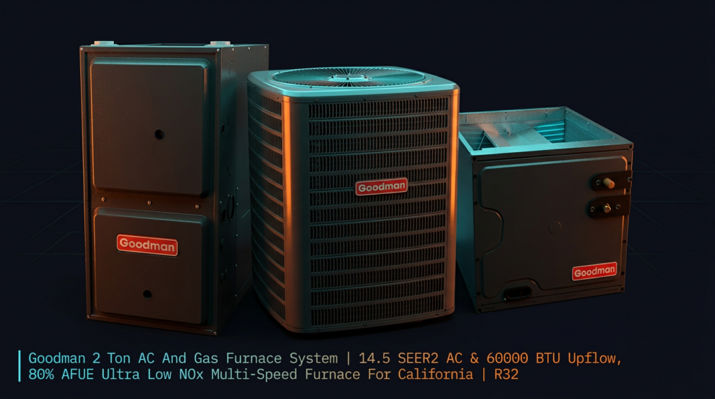 The Goodman 2 Ton AC and Gas Furnace System combines a 14.5 SEER2 R32 air conditioner with a 60,000 BTU, 80% AFUE ultra-low NOx gas furnace designed for California compliance. This upflow system delivers efficient cooling and heating for homes seeking reliable performance with lower emissions in SCAQMD and San Joaquin Valley air quality districts.