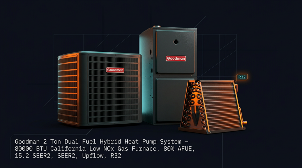 Goodman 2 Ton Dual Fuel Hybrid Heat Pump System – 80000 BTU California Low NOx Gas Furnace, 80% AFUE, 15.2 SEER2, Upflow, R32