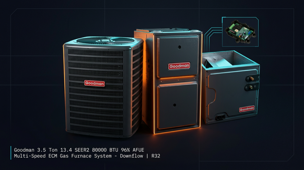 The Goodman 3.5 Ton 13.4 SEER2 80000 BTU 96% AFUE Multi-Speed ECM Gas Furnace System delivers efficient heating and cooling for residential applications. This downflow configuration includes a factory-charged condenser, gas furnace, and evaporator coil pre-matched for R32 refrigerant. It’s built for homeowners and contractors seeking reliable performance with high seasonal efficiency ratings.