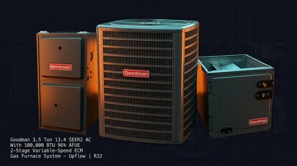 Goodman 3.5 Ton 13.4 SEER2 AC With 100000 BTU 96% AFUE 2-Stage Variable-Speed ECM Gas Furnace System – Upflow | R32