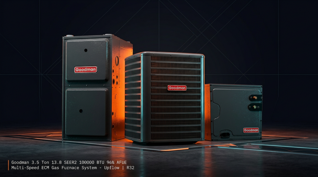 The Goodman 3.5 Ton 13.8 SEER2 100000 BTU 96% AFUE Multi-Speed ECM Gas Furnace System delivers high-efficiency heating and cooling for residential applications. This upflow configuration includes a matching condenser, evaporator coil, and furnace pre-charged and ready for installation. The R32 refrigerant and multi-speed compressor provide energy savings and consistent comfort year-round.