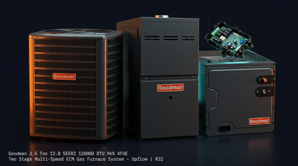 Goodman 3.5 Ton 13.8 SEER2 120000 BTU 96% AFUE Two Stage Multi-Speed ECM Gas Furnace System – Upflow | R32