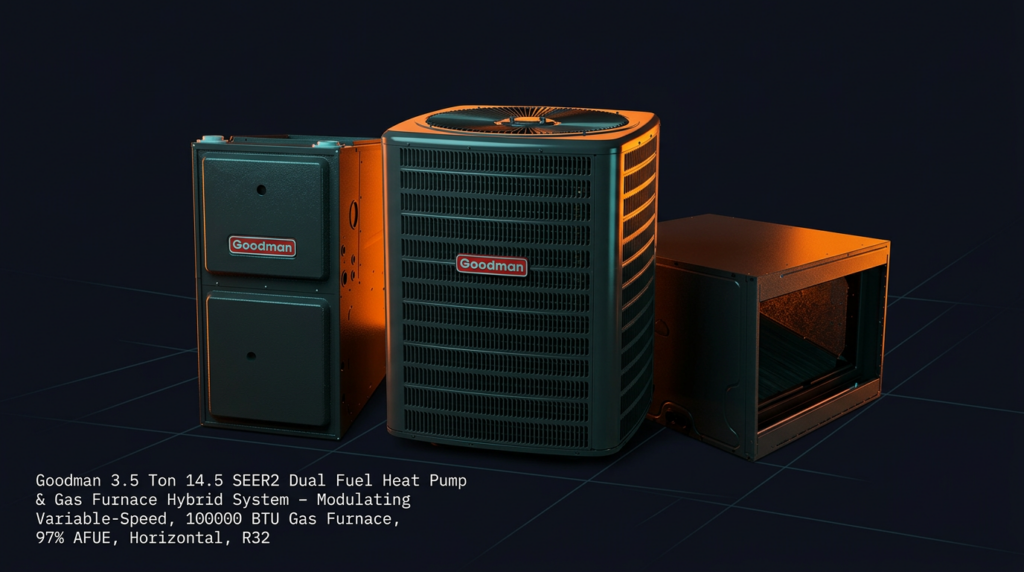 The Goodman 3.5 Ton 14.5 SEER2 Dual Fuel Heat Pump and Gas Furnace Hybrid System delivers efficient heating and cooling for larger homes and light commercial applications. This modulating variable-speed system pairs a 15.2 SEER2 heat pump condenser with a 100,000 BTU gas furnace rated at 97% AFUE, providing year-round comfort with reduced energy consumption.