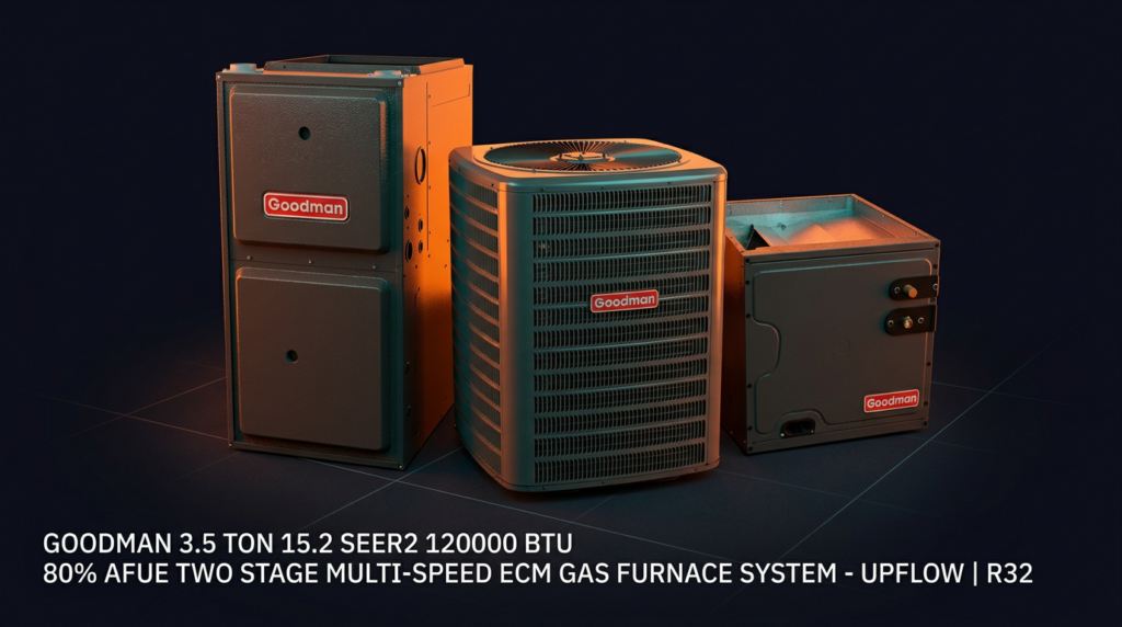 Goodman 3.5 Ton 15.2 SEER2 120000 BTU 80% AFUE Two Stage Multi-Speed ECM Gas Furnace System – Upflow | R32