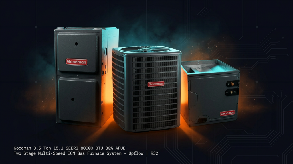 The Goodman 3.5 Ton 15.2 SEER2 Two Stage Multi-Speed ECM Gas Furnace System delivers efficient heating and cooling for residential applications using R32 refrigerant. This upflow configuration combines a high-efficiency air conditioner with an 80% AFUE two-stage furnace, making it ideal for homeowners seeking lower operating costs without compromising comfort. The multi-speed ECM motor and two-stage gas valve ensure quiet, economical performance across varying load conditions.