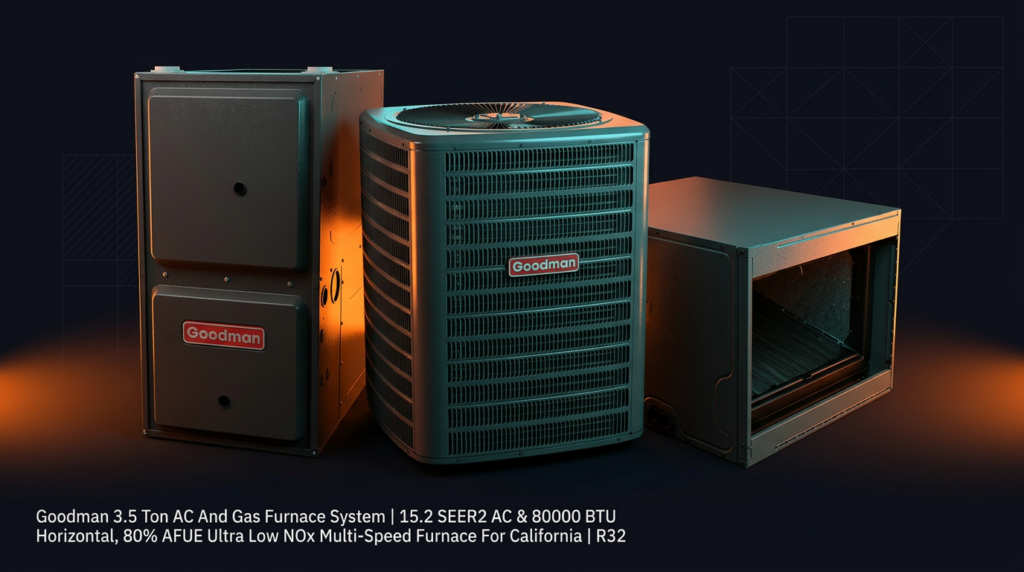 The Goodman 3.5 Ton AC and Gas Furnace System delivers efficient cooling and heating for homeowners in California and other regulated markets. This R32-ready combination pairs a 15.2 SEER2 air conditioner with an 80% AFUE, 80,000 BTU horizontal furnace engineered to meet South Coast AQMD and San Joaquin Valley air quality standards. The system is ideal for those seeking reliable performance with lower environmental impact.