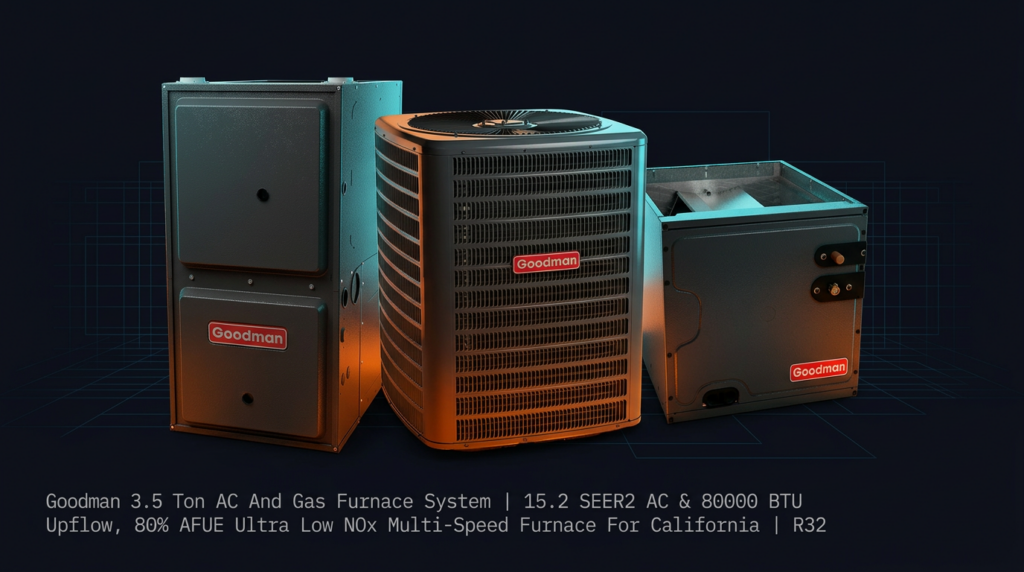 Goodman 3.5 Ton AC And Gas Furnace System | 15.2 SEER2 AC & 80000 BTU Upflow, 80% AFUE Ultra Low NOx Multi-Speed Furnace For California | R32
