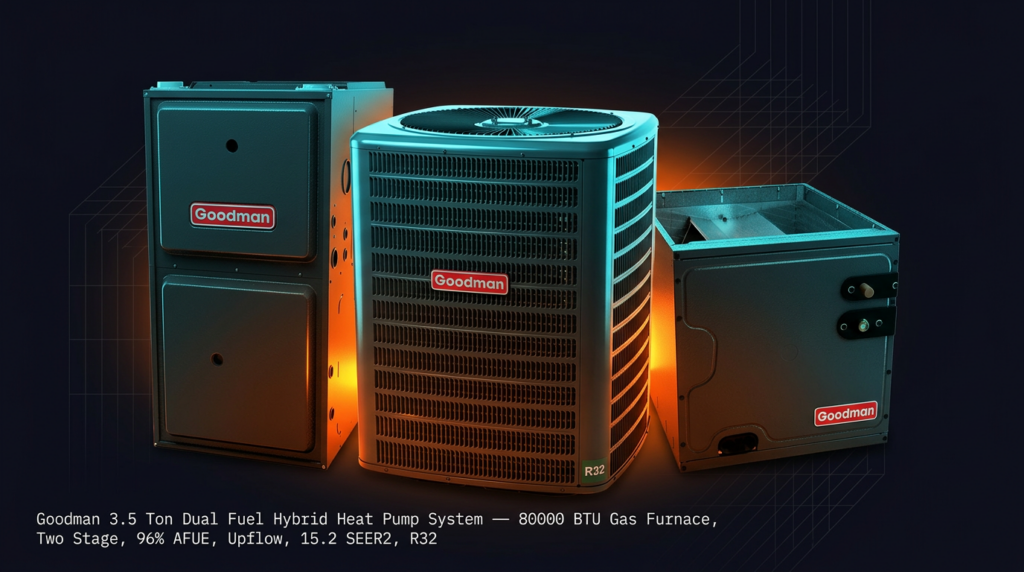The Goodman 3.5 Ton Dual Fuel Hybrid Heat Pump System combines efficient heat pump operation with an 80,000 BTU gas furnace for year-round comfort in larger homes. This two-stage system delivers 15.2 SEER2 cooling efficiency and 96% AFUE heating efficiency with R32 refrigerant. It’s designed for homeowners who need reliable performance across varied climates without compromising on efficiency ratings.
