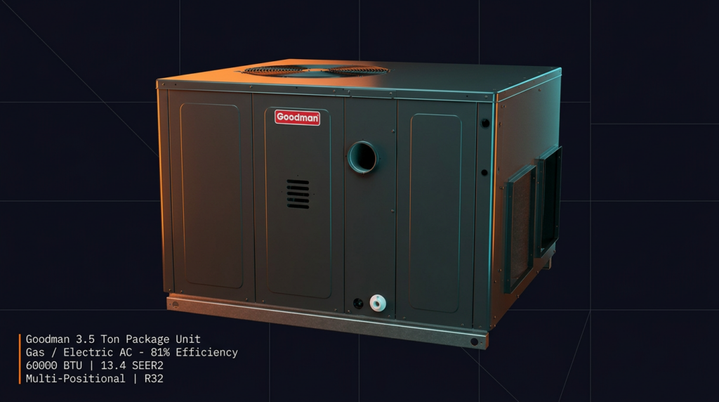 The Goodman 3.5 Ton Package Unit Gas/Electric AC (Model GPGM34206031) combines heating and cooling in a single rooftop or ground-level unit, ideal for commercial buildings, light industrial facilities, and applications requiring space efficiency. This multi-positional unit delivers 60,000 BTU of heating capacity with 13.4 SEER2 cooling efficiency, using R32 refrigerant for reliable performance and environmental compliance.