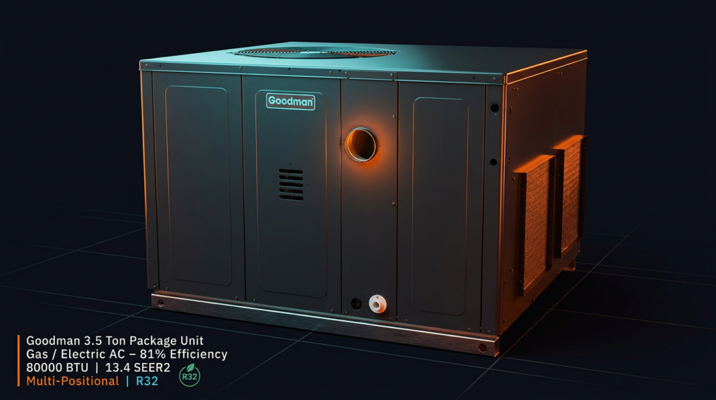 The Goodman 3.5 Ton Package Unit GPGM34208031 combines a gas furnace and electric air conditioner in a single multi-positional unit rated at 13.4 SEER2 and 81% AFUE efficiency. This R32 refrigerant package unit is designed for residential installations where space is limited and a combined heating and cooling solution is preferred. The unit delivers 80,000 BTU of heating capacity with modern efficiency ratings that reduce operating costs.