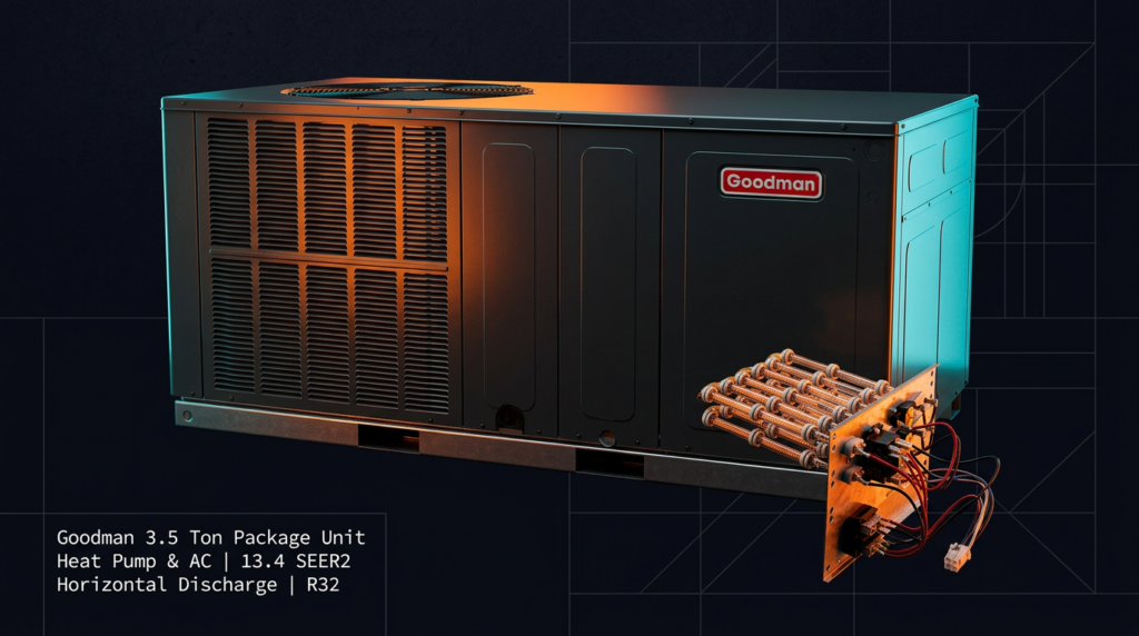 The Goodman 3.5 Ton Package Unit Heat Pump & AC (Model GPHH34231) is a single-unit solution combining heating and cooling in one rooftop or ground-mounted installation. This unit delivers 13.4 SEER2 efficiency and operates on R32 refrigerant, making it ideal for residential applications where space is limited or a split-system installation isn’t practical. The horizontal discharge design and optional heating element configurations provide flexible deployment options.