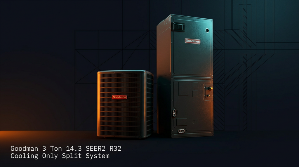 The Goodman 3 Ton 14.3 SEER2 R32 Cooling Only Split System delivers high-efficiency air conditioning using environmentally friendly R32 refrigerant. This system pairs the GLXS4BA3610 condenser with the AMST36BU1300 air handler and is built for contractors and homeowners seeking reliable cooling performance with modern refrigerant technology.