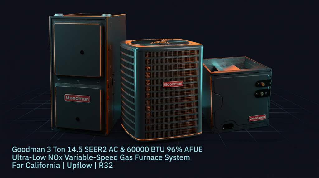 The Goodman 3 Ton 14.5 SEER2 AC and 60000 BTU 96% AFUE Ultra-Low NOx Variable-Speed Gas Furnace System is a complete heating and cooling solution designed for California installations. This R32 system meets strict emissions standards for the South Coast Air Quality Management District (SCAQMD) and San Joaquin Valley Air Pollution Control District (SJVUAPCD), making it compliant with Rule 1111 and Rule 4905 NOx limits. The upflow configuration with variable-speed compressor and multi-speed blower delivers efficient comfort year-round.