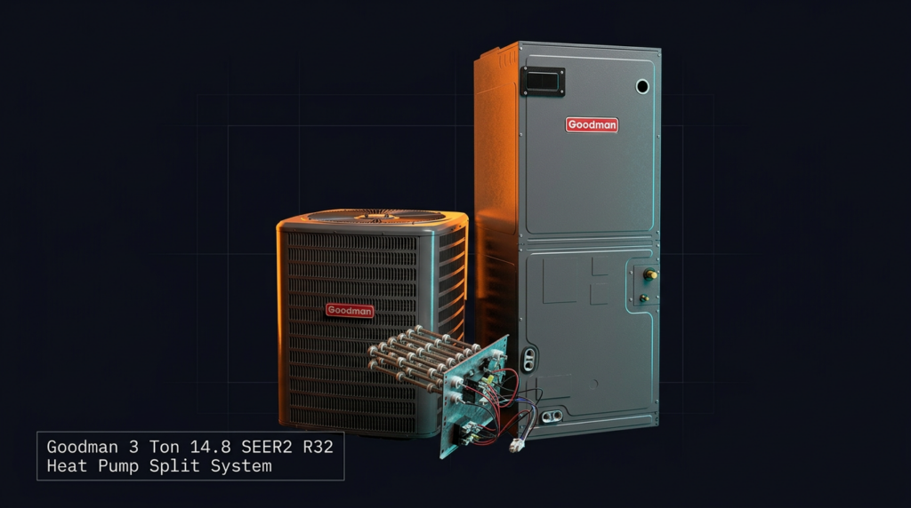 The Goodman 3 Ton 14.8 SEER2 R32 Heat Pump Split System delivers high-efficiency heating and cooling for residential applications using environmentally friendly R32 refrigerant. This system is built for contractors and homeowners who need reliable performance with modern efficiency ratings. The combination of a high-efficiency scroll compressor and optimized R32 design provides dependable operation across heating and cooling seasons.