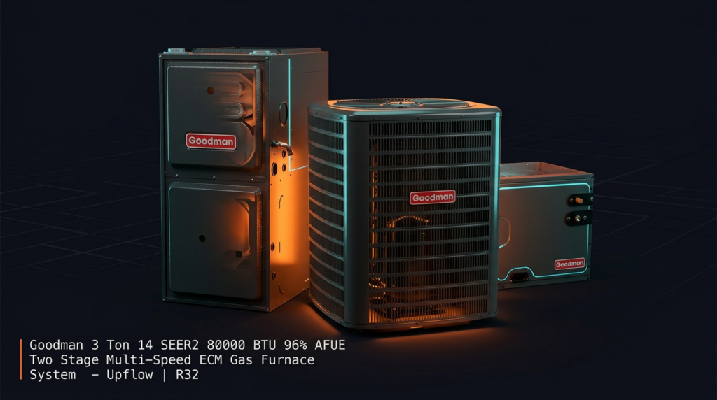 The Goodman 3 Ton 14 SEER2 Two Stage Multi-Speed ECM Gas Furnace System delivers efficient heating and cooling for residential applications. This upflow configuration combines a high-efficiency furnace with an R32 condenser coil, making it ideal for homeowners seeking lower operating costs and reduced environmental impact. The system is fully charged and factory-assembled for straightforward installation.