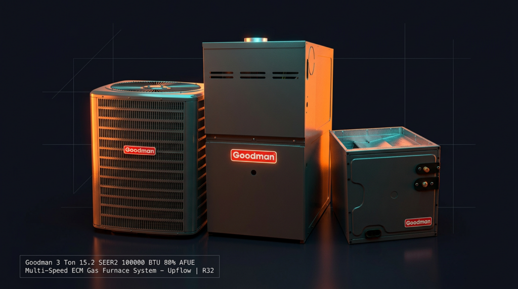 The Goodman 3 Ton 15.2 SEER2 Gas Furnace System delivers efficient heating and cooling for residential applications with R32 refrigerant technology. This upflow configuration combines a high-efficiency air conditioner with an 80% AFUE gas furnace, making it suitable for homeowners seeking reliable climate control with solid efficiency ratings. The multi-speed ECM blower motor adapts to varying load conditions for consistent comfort.