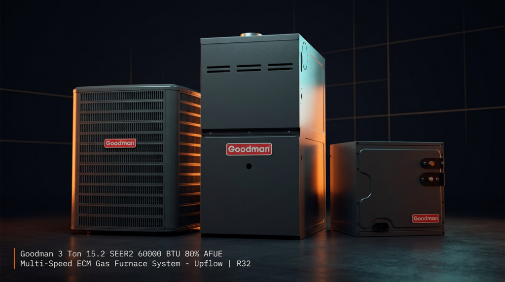 The Goodman 3 Ton 15.2 SEER2 60000 BTU 80% AFUE Multi-Speed ECM Gas Furnace System delivers efficient heating and cooling for residential applications. This R32 upflow unit combines a high-efficiency air conditioner with a durable gas furnace, making it suitable for homeowners and contractors seeking reliable performance with solid efficiency ratings.