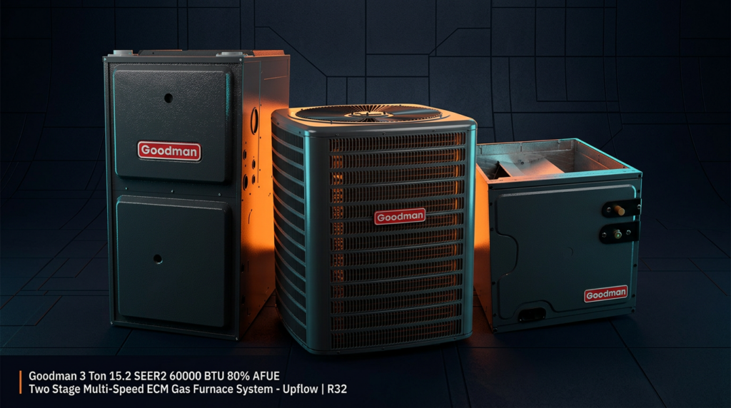 The Goodman 3 Ton 15.2 SEER2 Two-Stage Gas Furnace System with R32 refrigerant delivers efficient heating and cooling for residential applications in upflow configurations. This matched system combines a high-efficiency air conditioner with a dual-stage furnace and multi-speed ECM motor to reduce operating costs and noise. It is designed for homeowners and contractors seeking reliable performance with solid efficiency ratings and a 10-year parts warranty.