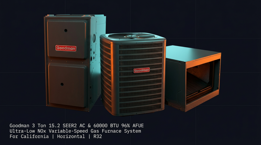 The Goodman 3 Ton 15.2 SEER2 AC and 60000 BTU 96% AFUE Ultra-Low NOx Variable-Speed Gas Furnace System delivers high-efficiency heating and cooling in a single package rated for California air quality standards. This horizontal R32 system is engineered for homeowners and contractors in SCAQMD and SJVUAPCD districts who need reliable performance without compromising on efficiency or emissions compliance.