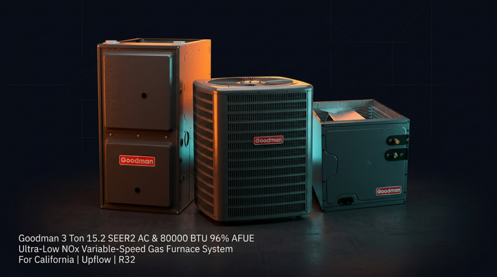 The Goodman 3 Ton 15.2 SEER2 AC and 80000 BTU 96% AFUE Ultra-Low NOx Variable-Speed Gas Furnace System is a complete heating and cooling solution engineered for California installations. This system meets stringent SCAQMD and SJVUAPCD NOx emissions standards while delivering high-efficiency operation with R32 refrigerant technology. The combination of advanced cooling efficiency and ultra-low NOx gas heating makes this ideal for California homeowners and contractors working in air quality management districts.