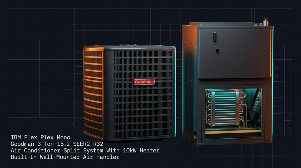 The Goodman 3 Ton 15.2 SEER2 R32 Air Conditioner Split System delivers high-efficiency cooling with integrated 10kW electric heating in a wall-mounted air handler configuration. This system is designed for homeowners and contractors seeking modern R32 refrigerant technology with AHRI certification and energy-efficient performance for residential applications.