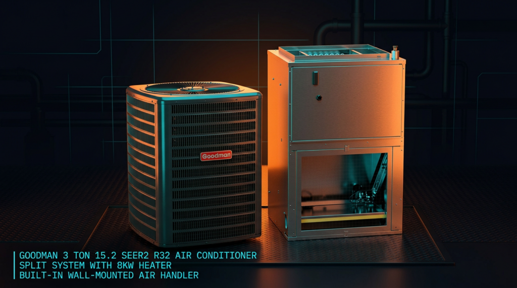 The Goodman 3 Ton 15.2 SEER2 R32 Split System with 8kW Built-In Heater delivers high-efficiency cooling and heating in a wall-mounted configuration. This system pairs the GLXS4B condenser with the AWST36LU1308 air handler and is designed for homeowners and contractors seeking energy-efficient climate control with integrated heating capacity.