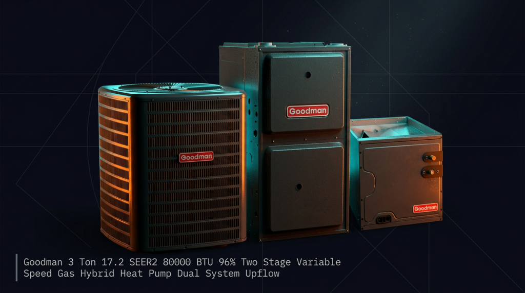 The Goodman 3 Ton 17.2 SEER2 Two Stage Variable Speed Gas Hybrid Heat Pump Dual System is a complete heating and cooling solution combining a high-efficiency heat pump condenser with a 96% gas furnace. This system delivers reliable performance for homeowners seeking efficient dual-fuel heating with advanced diagnostics and smart controls.