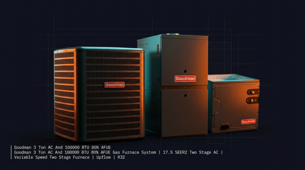 Goodman 3 Ton AC And 100000 BTU 80% AFUE Gas Furnace System | 17.5 SEER2 Two Stage AC | Variable Speed Two Stage Furnace | Upflow | R32