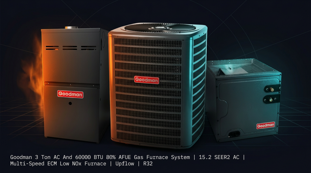 Goodman 3 Ton AC And 60000 BTU 80% AFUE Gas Furnace System | 15.2 SEER2 AC | Multi-Speed ECM Low NOx Furnace | Upflow | R32
