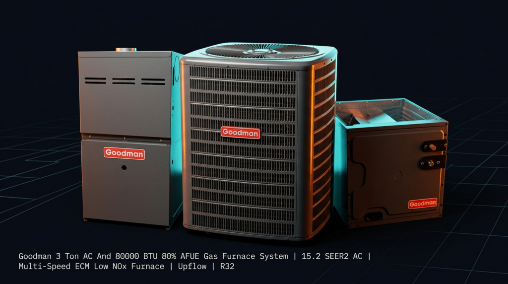 Goodman 3 Ton AC And 80000 BTU 80% AFUE Gas Furnace System | 15.2 SEER2 AC | Multi-Speed ECM Low NOx Furnace | Upflow | R32