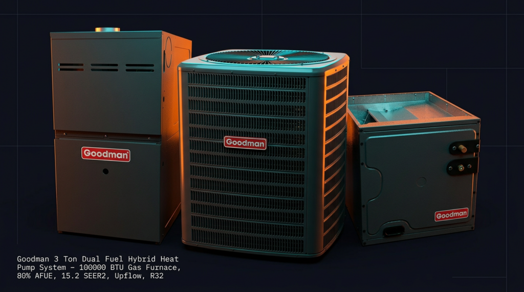 The Goodman 3 Ton Dual Fuel Hybrid Heat Pump System combines a 15.2 SEER2 heat pump with a 100,000 BTU gas furnace for efficient year-round heating and cooling. This system is designed for mid-to-large residential homes that need flexible heating options and strong efficiency ratings. The hybrid setup automatically switches between heat pump and gas furnace operation to optimize comfort and energy costs.