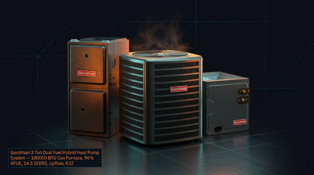 The Goodman 3 Ton Dual Fuel Hybrid Heat Pump System combines a high-efficiency heat pump condenser with a 100,000 BTU gas furnace for year-round comfort and energy savings. This system is ideal for homeowners in moderate to cold climates who want the efficiency of heat pump heating with gas backup for extreme temperatures. With 14.5 SEER2 efficiency and 96% AFUE, this setup delivers lower utility bills while maintaining reliable performance.