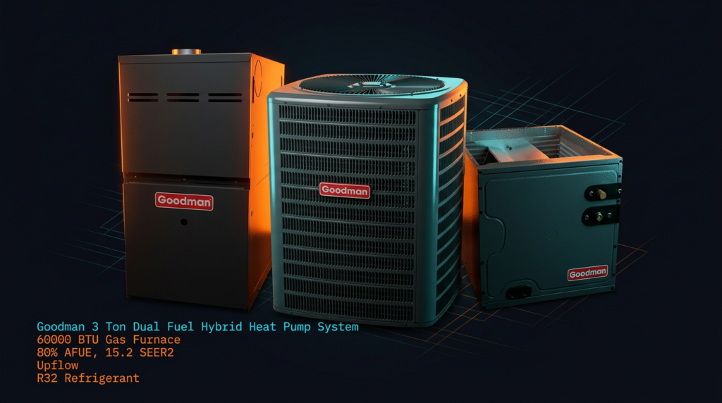 The Goodman 3 Ton Dual Fuel Hybrid Heat Pump System combines a 15.2 SEER2 heat pump with a 60,000 BTU gas furnace for year-round efficiency and heating capacity. This system is designed for mid-to-large residential spaces that need reliable comfort in mixed climates. The hybrid approach optimizes seasonal performance while the R32 refrigerant and 80% AFUE furnace deliver both cooling and heating efficiency.