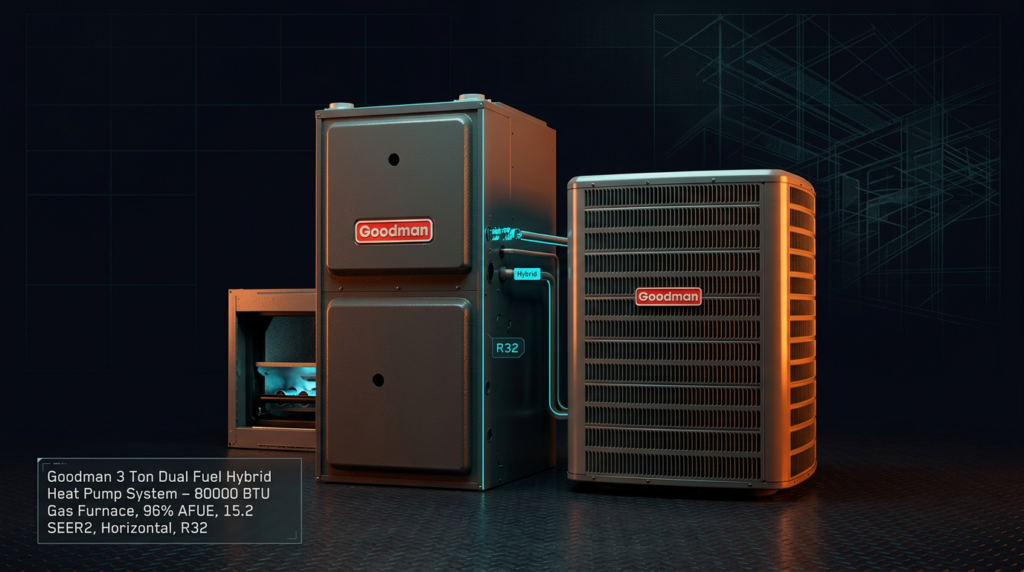 The Goodman 3 Ton Dual Fuel Hybrid Heat Pump System combines a high-efficiency heat pump with an 80000 BTU gas furnace to deliver year-round comfort and energy savings. This system is designed for homeowners seeking flexibility between electric and gas heating, with R32 refrigerant providing improved efficiency and environmental performance. The 96% AFUE gas furnace and 15.2 SEER2 heat pump ratings make this an excellent choice for reducing utility costs.