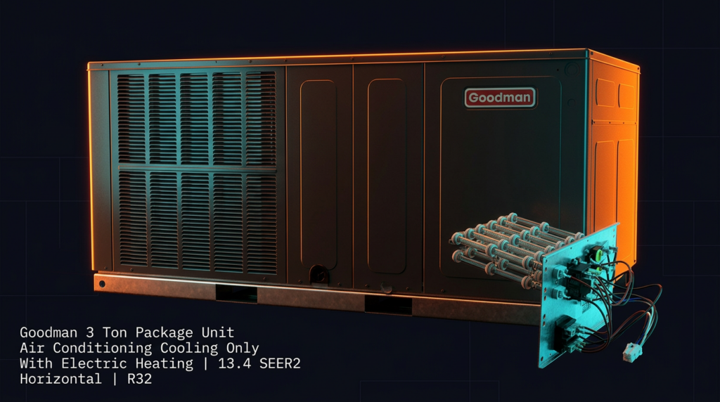 The Goodman 3 Ton Package Unit (Model GPCH33631) delivers efficient cooling-only operation in a compact horizontal design, ideal for retrofit installations and new construction where rooftop or ground-level mounting is required. This unit achieves 13.4 SEER2 efficiency using R32 refrigerant and can be paired with optional electric heating elements for year-round climate control.